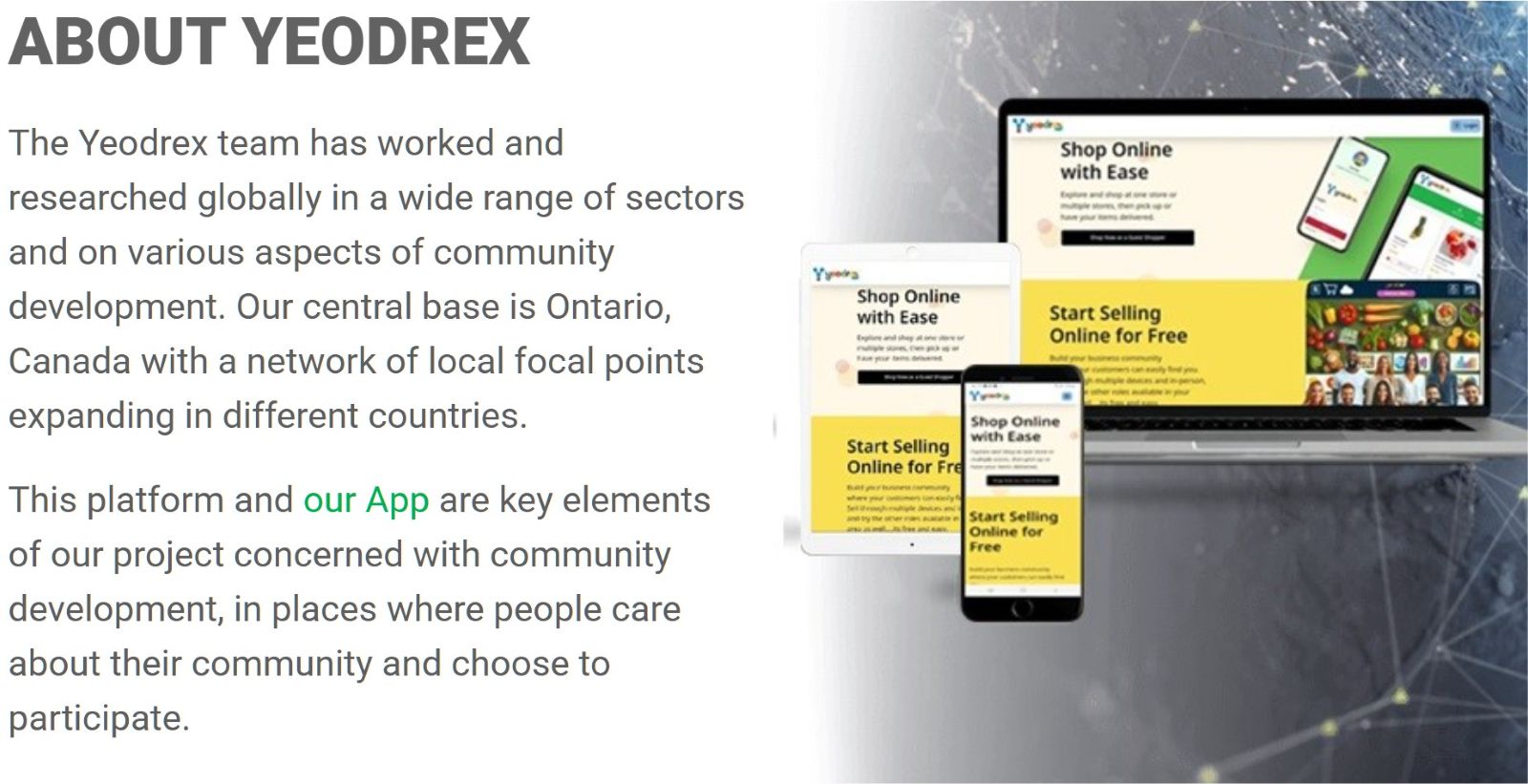 Yeodrex is a digital platform start-up (e-commerce) based in Ontario looking to reach all levels of people and organizations in the food industry to join and operate their businesses free of cost on our WebApp: https://yeodrex.com/ords/r/yeodrex/yeodrex/home . Yeodrex is a social enterprise. Our Webapp is only active now for live testing in Ontario, but we can activate it in any location based on user demand.