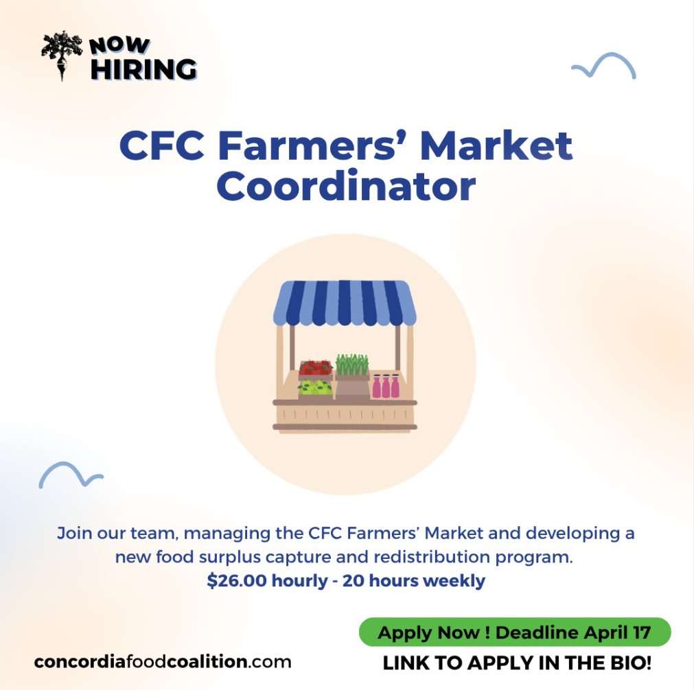 As the Market Coordinator, this position will co-lead the Concordia Food Coalition's (CFC) strategy and programming with a primary focus on managing the CFC Farmers’ Market, a flagship project of the CFC, and developing a new food surplus capture and redistribution program. The role ensures the growth and sustainability of the Farmers' Market and oversees the development of key food waste reduction strategies and partnerships. The Coordinator will also play a role in strategic program improvement and advocacy within the food system at Concordia.