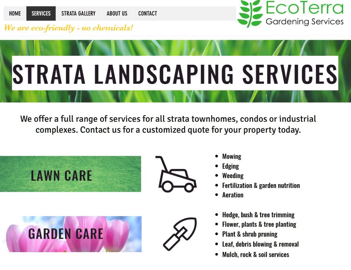 EcoTerra Gardening is a fully green landscaping company that doesn't use any chemicals. We are a small business run by a husband and wife and look for staff who love the outdoors and getting their hands dirty away from the usual indoor work life.